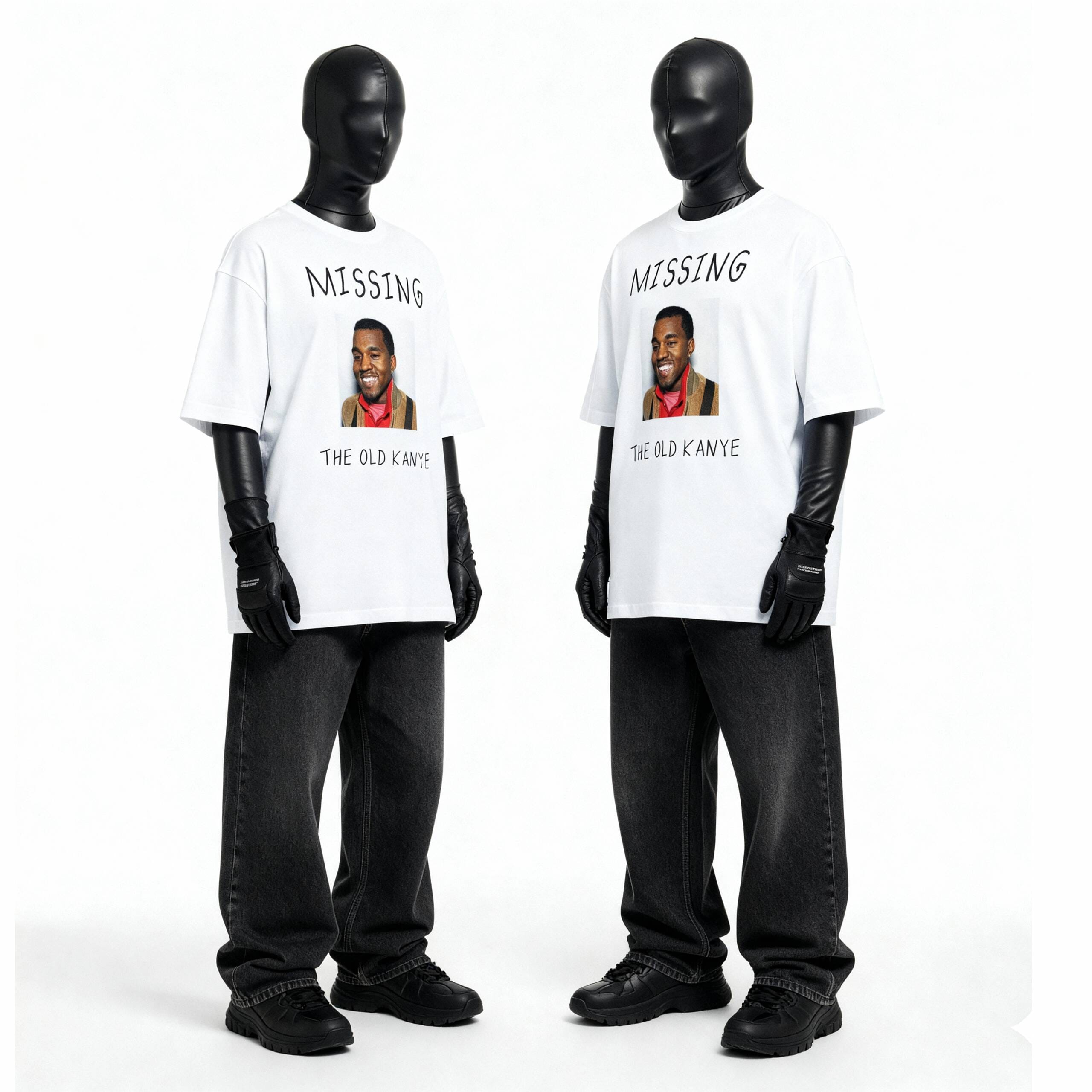 Models wearing Missing Old Kanye graphic text t-shirt in streetwear style.Missing old kanye t-shirt