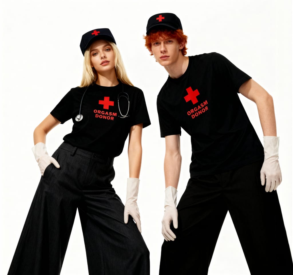 Models wearing the black 'Orgasn Donor' t-shirt as part of a sexy nurse costume.ORGASM DONOR t-shirt