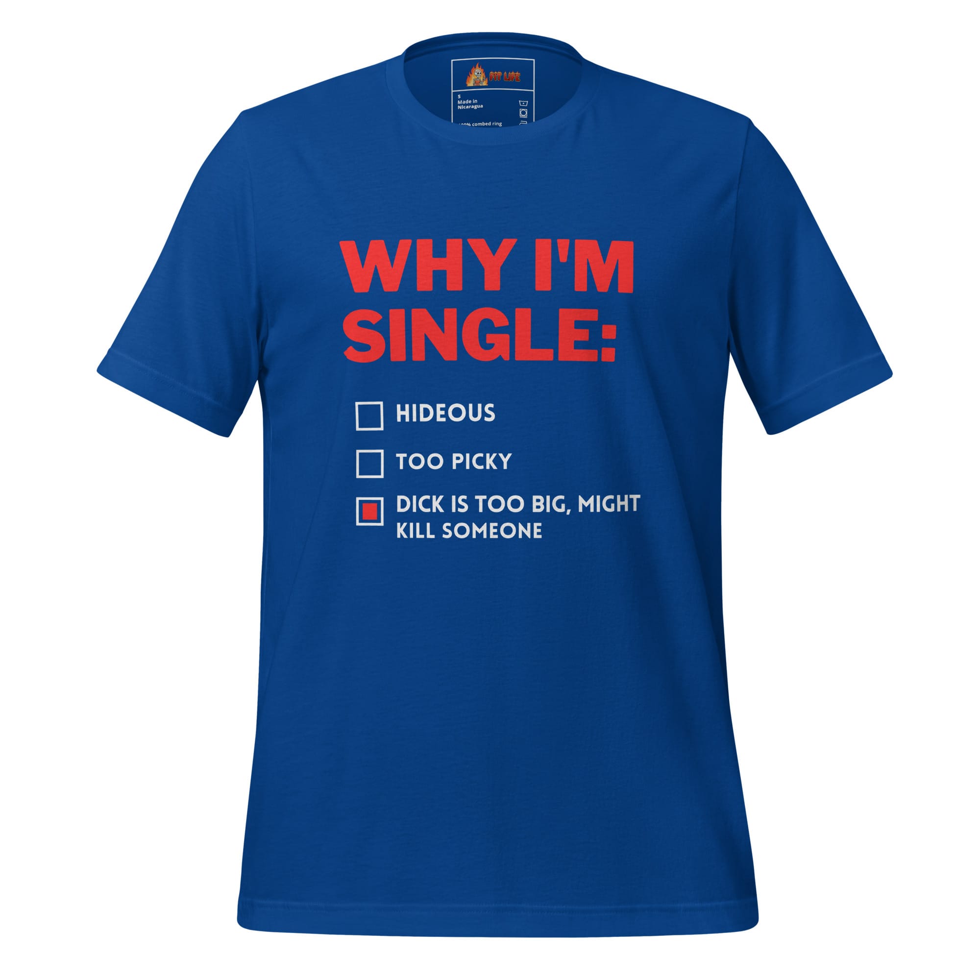 Get the viral Why I’m Single Dick Is Too Big T-Shirt . This provocative text tee lists all the reasons: Hideous? Too Picky? Dick is too big? Get yours. Shop Fit Life.